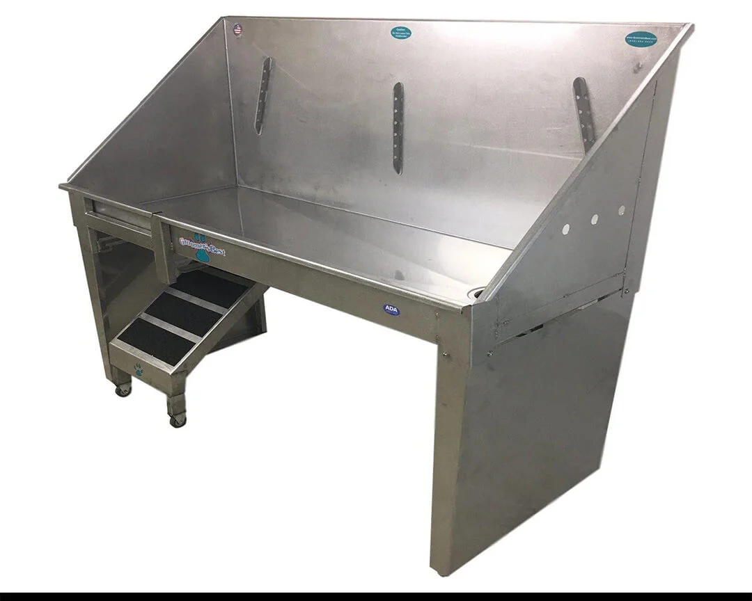 Made out of 304 stainless steel, this 58" tub features the conveniences that today's groomers need for a lifetime of use! Groomer's Best ADA-compliant walk-through bathtub with lift and slide ramp. This is the grooming industry's first ADA (Americans with Disabilities Act) compliant dog grooming tub!