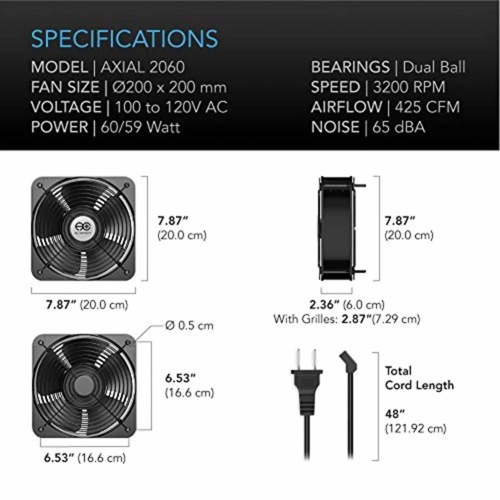 - 200 x 200 x 60 mm (7.87 x 7.87 x 2.36 in.) | 100 to 120V AC | Max Airflow: 425 CFM |