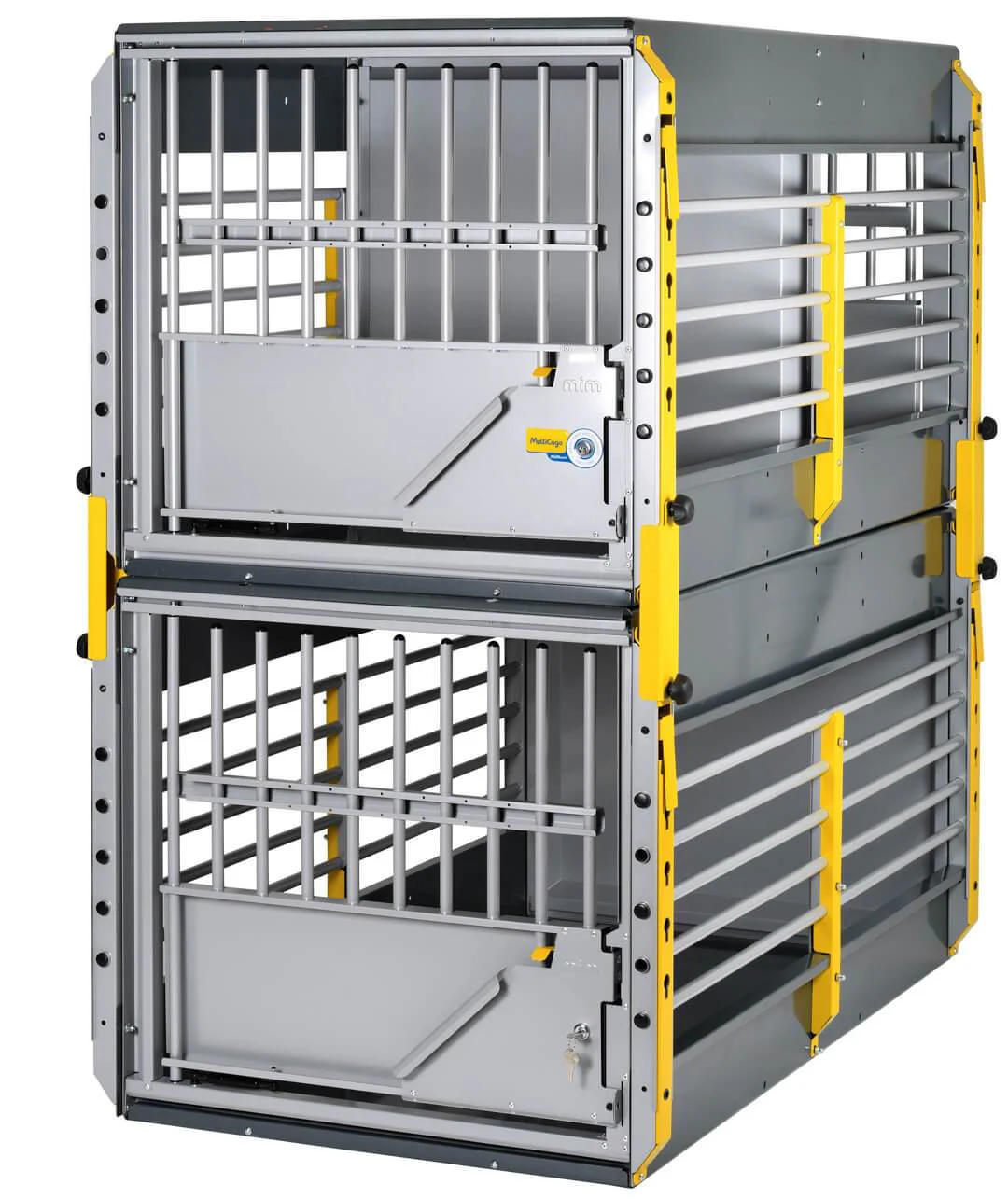 MultiCage is the world’s ONLY crash-tested stackable multi-dog transport kennel and is Ideal for transporting multiple dogs in a variety of vehicles. Optional Brackets can lock & secure several MultiCages together for maximum safety & security of many dogs in individual cages. The robust construction and its square design make the cage suitable for transport vehicles, motorhomes, vans and pickups.
