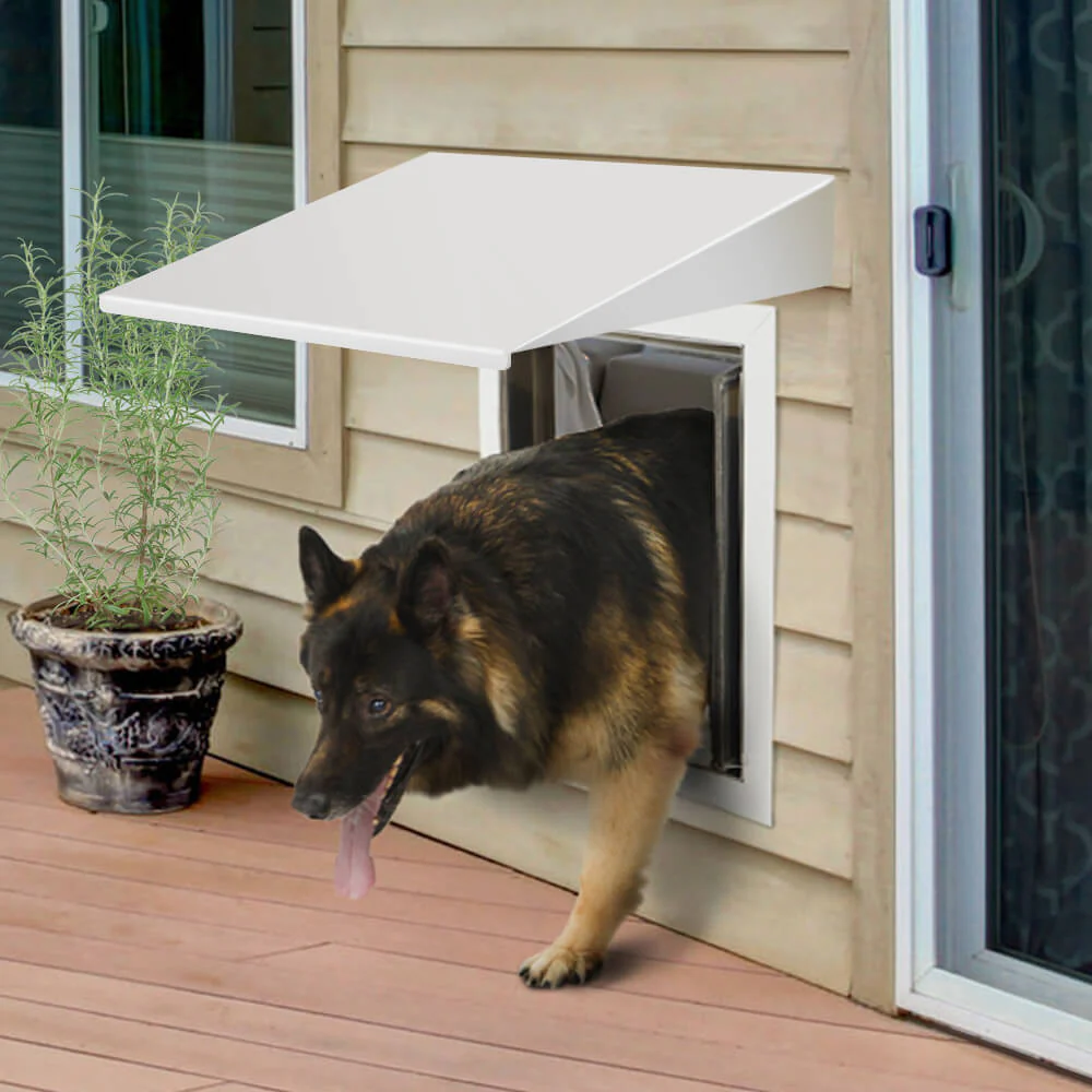 PlexiDor dog door aluminum awnings are designed to protect and shelter your dog door from the elements, preventing rain, sun and wind from entering your home through your pet door. This attractive awning is made of aluminum and features a durable baked-on-finish. Compatible with Door and Wall installations.